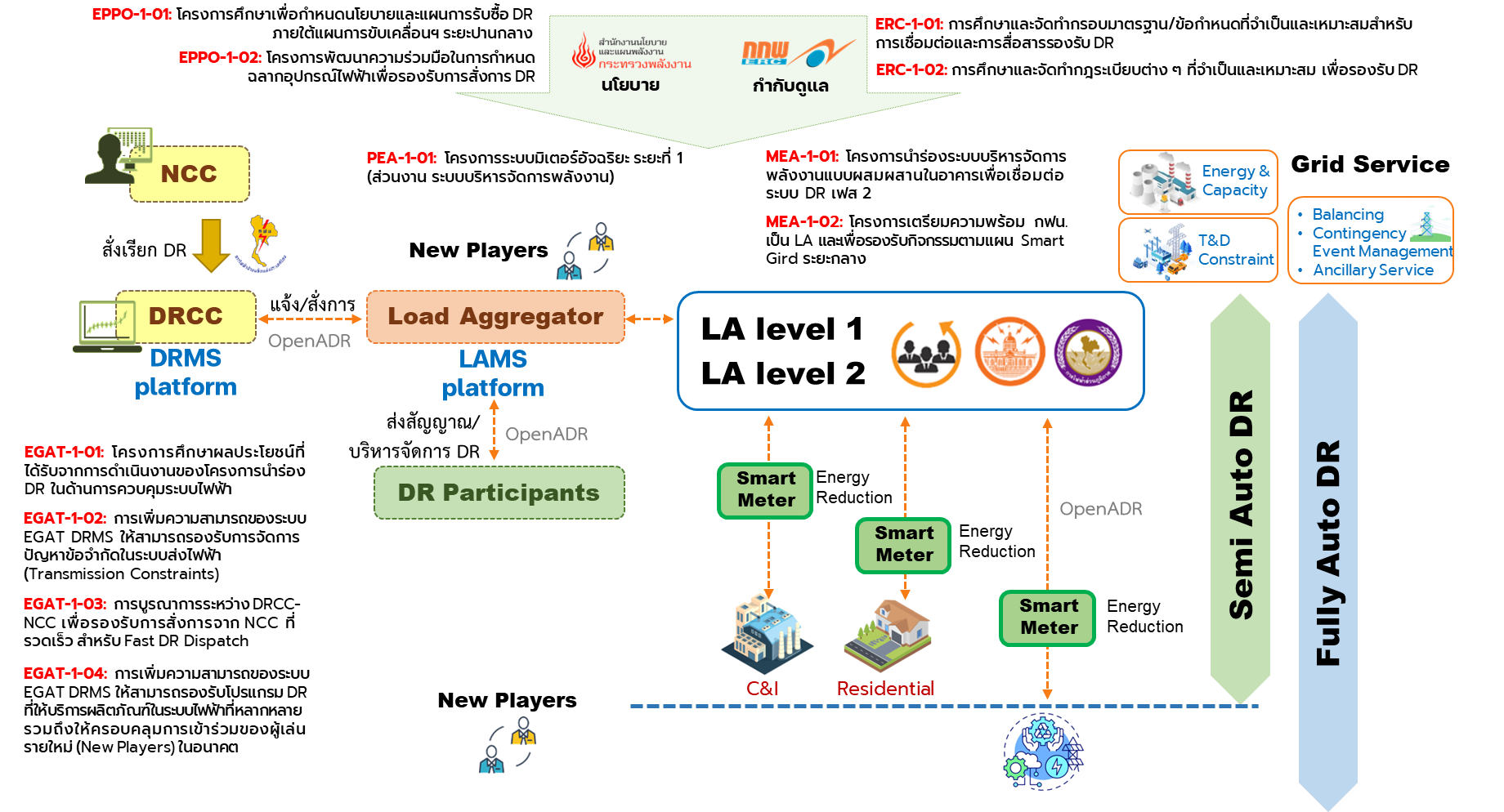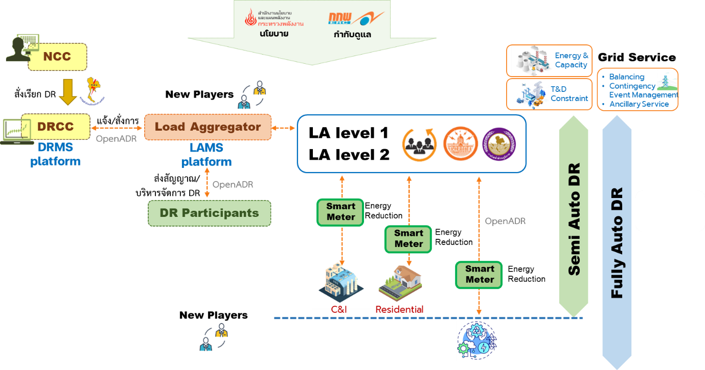 - สำนักงานคณะกรรมการกำกับกิจการพลังงาน (สำนักงาน สกพ.) เป็นผู้รับผิดชอบหลักด้านกฎระเบียบ โดยดำเนินการศึกษา (ERC-1-01) และจัดทำกรอบมาตรฐาน/ข้อกำหนดที่จำเป็นและเหมาะสมสำหรับการเชื่อมต่อและการสื่อสารรองรับการตอบสนองด้านโหลด (Demand Response) และศึกษา (ERC-1-02) และจัดทำกฎระเบียบต่าง ๆ ที่จำเป็นและเหมาะสม เพื่อเตรียมความพร้อมในการรองรับผู้รวบรวมโหลด (LA) ภาคเอกชน และรองรับการตอบสนองด้านโหลด (Demand Response) ทั้งแบบกึ่งอัตโนมัติ (Semi-Auto DR) และแบบอัตโนมัติ (Auto DR) รวมถึงรองรับธุรกิจใหม่ (New Business) และผู้เล่นรายใหม่ ๆ ในโครงสร้างของการตอบสนองด้านโหลดและระบบบริหารจัดการพลังงาน (DR & EMS Ecosystem)