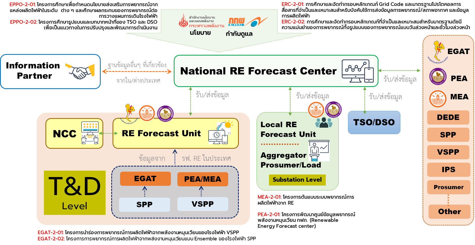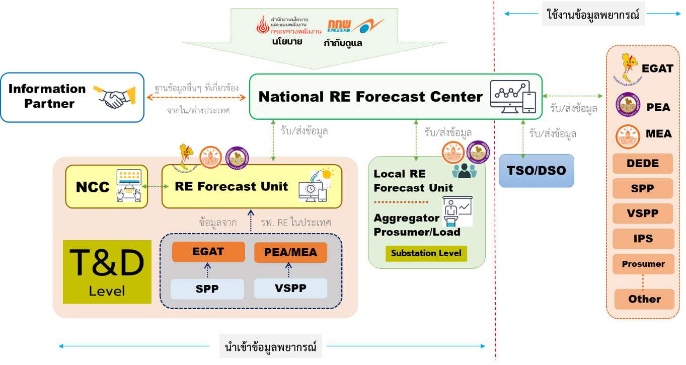 - สำนักงานคณะกรรมการกำกับกิจการพลังงาน (สำนักงาน สกพ.) ดำเนินการศึกษา (ERC-2-01) และจัดทำกรอบหลักเกณฑ์ Grid Code และมาตรฐานโปรโตคอลการสื่อสารที่จำเป็นและเหมาะสมสำหรับบังคับใช้การส่งข้อมูลการพยากรณ์/สภาพอากาศ และข้อมูลการผลิตไฟฟ้า และศึกษา (ERC-2-02) และจัดทำกรอบหลักเกณฑ์ที่จำเป็นและเหมาะสมสำหรับมาตรฐานดัชนีความแม่นยำของการพยากรณ์ทั้งรูปแบบของการพยากรณ์แบบวันล่วงหน้าและชั่วโมงล่วงหน้า โดยมีวัตถุประสงค์เพื่อกำหนดมาตรฐานการรับ-ส่งข้อมูลการพยากรณ์/อากาศ และข้อมูลการผลิตไฟฟ้าของโรงไฟฟ้าพลังงานหมุนเวียนในระดับต่าง ๆ นอกจากนี้ยังต้องมีการกำหนดดัชนีชี้วัดความแม่นยำของการพยากรณ์ที่เป็นเครื่องมือสำคัญของการประเมินประสิทธิภาพของการพยากรณ์ในระยะยาว