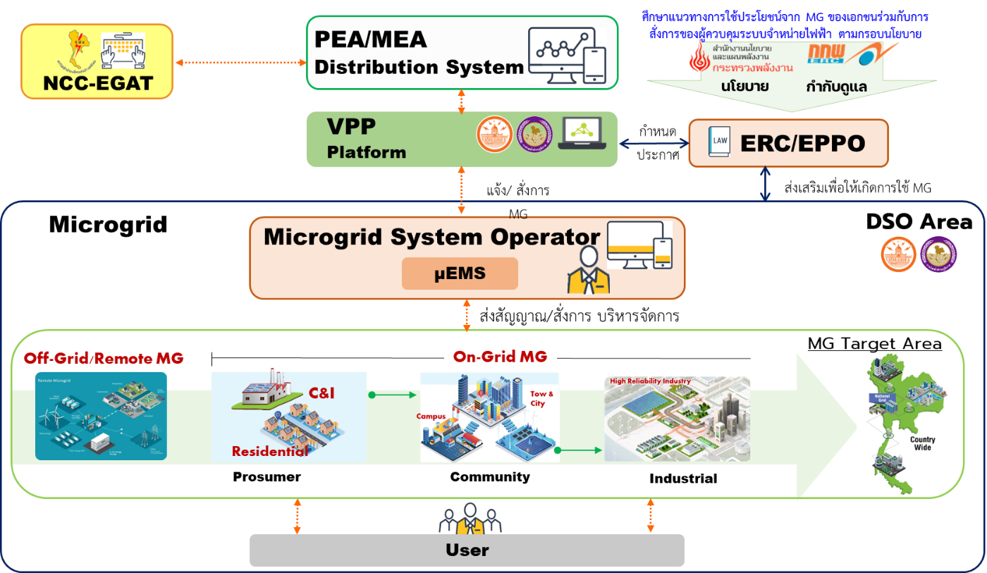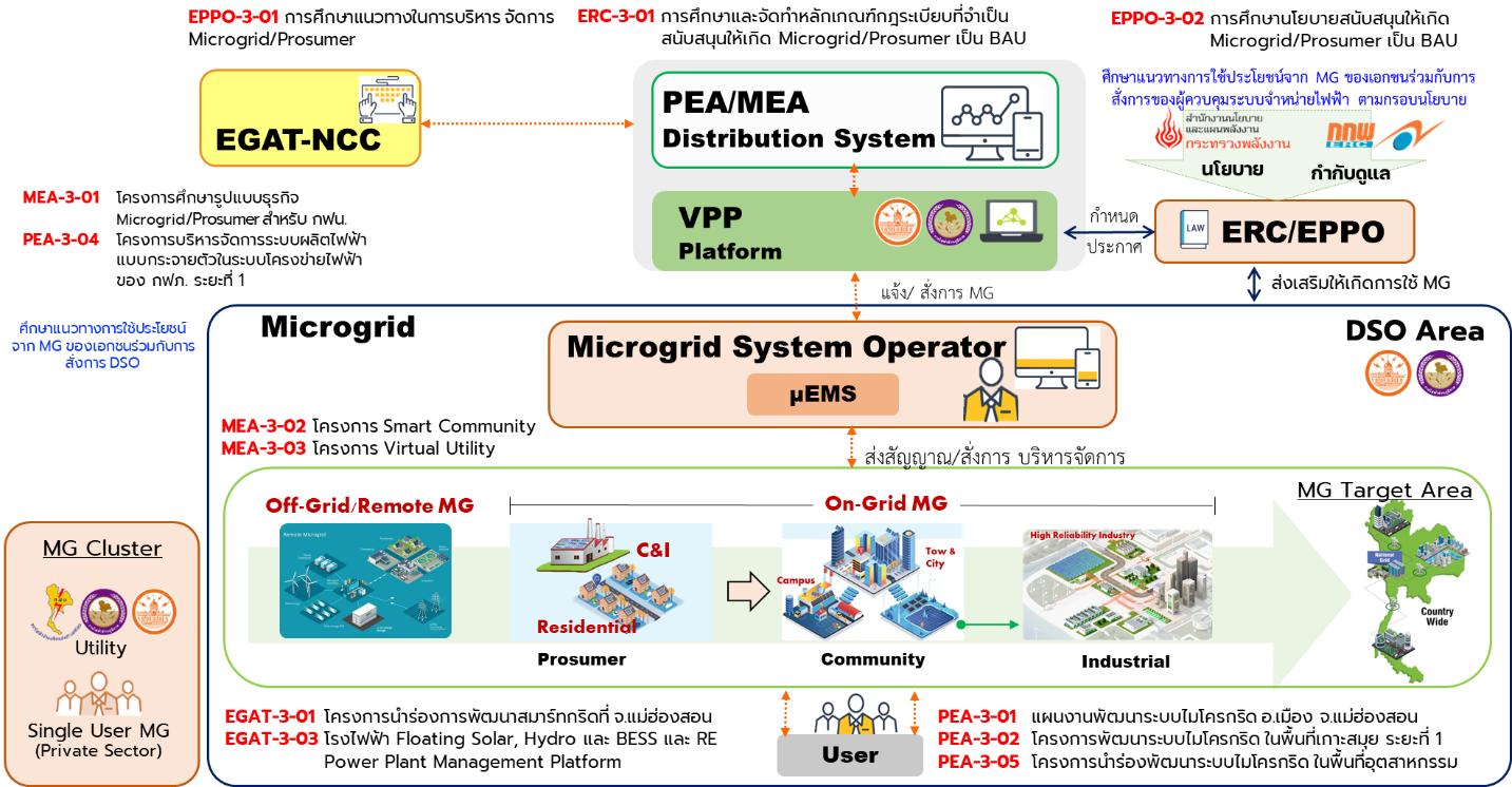 - สำนักงานนโยบายและแผนพลังงาน (สนพ.) ได้ดำเนินการตามโครงการ (EPPO-3-01) ที่เกี่ยวข้องกับการศึกษาแนวทางการบริหารจัดการและนโยบายที่สนับสนุนการใช้งานระบบไมโครกริดและโปรซูเมอร์ เพื่อรองรับการจัดทำแผน PDP รวมถึงแผนพัฒนาระบบส่งและระบบจำหน่ายของประเทศ โดยควบคู่ไปกับโครงการ (EPPO-3-02) ศึกษาเชิงนโยบายเพื่อสนับสนุนการนำไมโครกริด มาใช้ประโยชน์ร่วมกับระบบไฟฟ้าเพื่อส่งเสริมการใช้งานไมโครกริด ซึ่งมีความสอดคล้องกับแนวโน้มการเติบโตของยานยนต์ไฟฟ้าในเขตเมืองและพื้นที่ที่มีการใช้ VRE สูง โดยมีเป้าหมายเพื่อส่งเสริมการใช้งานเชิงพาณิชย์ โดยเน้นการเตรียมความพร้อมในการรองรับการขยายตัวของไมโครกริดในภาคอุตสาหกรรมในอนาคต ก่อนขยายผลการศึกษาที่จะนำไปสู่การส่งเสริมและสาธิตการใช้งานโรงไฟฟ้าเสมือน (VPP) ในการบริหารจัดการไมโครกริดและโปรซูเมอร์ที่เหมาะสมในระบบโครงข่ายไฟฟ้าของประเทศไทยในระยะยาวอย่างมีประสิทธิภาพ