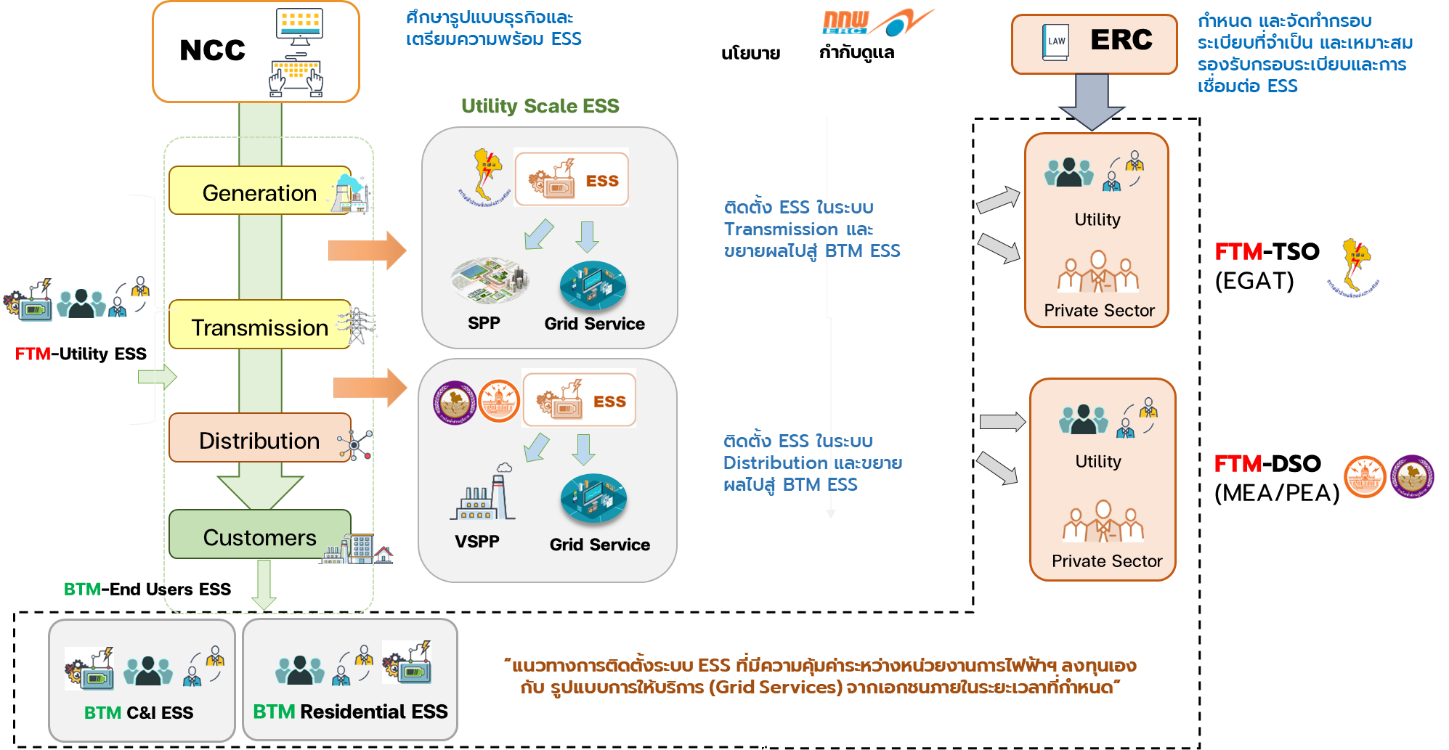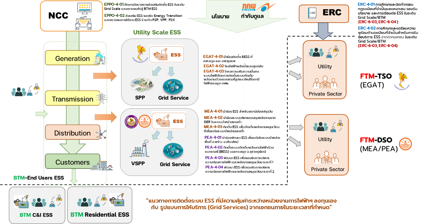 - สำนักงานคณะกรรมการกำกับกิจการพลังงาน (สำนักงาน สกพ.) ดำเนินโครงการ (ERC-4-01) ที่เกี่ยวข้องกับการศึกษาและจัดทำหลักเกณฑ์ กรอบกฎระเบียบ ที่จำเป็นและเหมาะสมเพื่อรองรับนโยบายและการดำเนินงานการเชื่อมต่อโครงข่ายไฟฟ้าสำหรับระบบกักเก็บพลังงาน (ESS) รวมถึงการศึกษา (ERC-4-02) และเตรียมความพร้อมด้านกฎระเบียบที่จำเป็นสำหรับการรับซื้อบริการจากระบบกักเก็บพลังงานตามทิศทางของด้านโยบายให้เกิดขึ้นอย่างเป็นรูปธรรมในระยะยาว