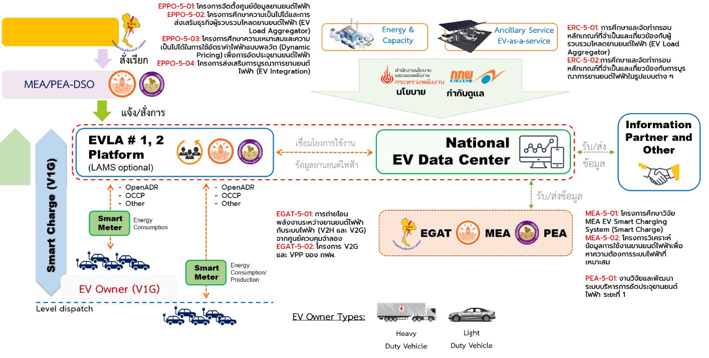- การไฟฟ้าทั้ง 3 แห่ง โดยหน่วยงาน กฟผ. ดำเนินการศึกษา (EGAT-5-01) การถ่ายโอนพลังงาน V2H และ V2G จากศูนย์ควบคุมจำลอง ในส่วนของหน่วยงาน กฟน. ดำเนินการศึกษา (MEA-5-01) วิจัย EV Smart Charging และศึกษา (MEA-5-02) วิเคราะห์ข้อมูล EV ที่เหมาะสม และหน่วยงาน กฟภ. ดำเนินการติดตั้ง (PEA-5-01) สถานีอัดประจุไฟฟ้ารองรับ EV ของประเทศ และพัฒนา (PEA-5-02) ระบบบริหารการอัดประจุยานยนต์ไฟฟ้า (EV Charging Management System) โดยทั้ง 3 การไฟฟ้านั้น จะมีหน้าที่รับผิดชอบหลัก คือ เตรียมความพร้อมของระบบและโครงสร้างพื้นฐานที่สามารถรองรับนโยบายและรูปแบบธุรกิจฯ ที่จะเกิดขึ้นในอนาคต