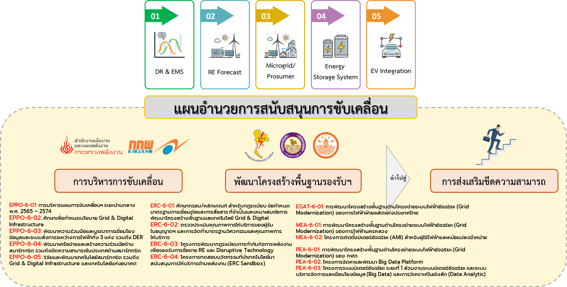 - สำนักงานนโยบายและแผนพลังงาน (สนพ.) ดำเนินการศึกษา (EPPO-6-01) การบริหารแผนการขับเคลื่อนฯ ระยะปานกลาง พ.ศ. 2565 – 2574 ศึกษา (EPPO-6-02) เพื่อกำหนดนโยบาย Grid & Digital Infrastructure พัฒนา (EPPO-6-03) ความร่วมมือและบูรณาการเชื่อมโยงข้อมูลและระบบสั่งการระหว่างการไฟฟ้าทั้ง 3 แห่ง รวมถึง DER ศึกษา (EPPO-6-04) พัฒนาเครือข่ายและสร้างความร่วมมือด้านสมาร์ทกริด รวมถึงขีดความสามารถในประเทศด้านสมาร์ทกริด และศึกษา (EPPO-6-05) วิจัยและพัฒนาเทคโนโลยีสมาร์ทกริด รวมถึง Grid & Digital Infrastructure และเทคโนโลยีแห่งอนาคต โดยโครงการศึกษาทั้งหมดฯ จะมุ่งเน้นติดตาม บริหาร และปรับปรุงแผนขับเคลื่อนระยะปานกลางให้มีความสอดคล้องกับสถานการณ์ ควบคู่กับการพัฒนาความร่วมมือและเชื่อมโยงข้อมูล/ระบบสั่งการของการไฟฟ้าทั้ง 3 แห่ง นอกจากนี้ยังเป็นการกำหนดนโยบายและเป้าหมายการพัฒนาและใช้งานโครงสร้างพื้นฐานทั้งด้านระบบไฟฟ้าและดิจิทัลที่ต้องมีการพัฒนาเครือข่าย สนับสนุนงานวิจัยและพัฒนาซอฟต์แวร์และฮาร์ดแวร์ มาประยุกต์ใช้ร่วมกับรูปแบบธุรกิจและระบบไฟฟ้าสมัยใหม่ด้วย