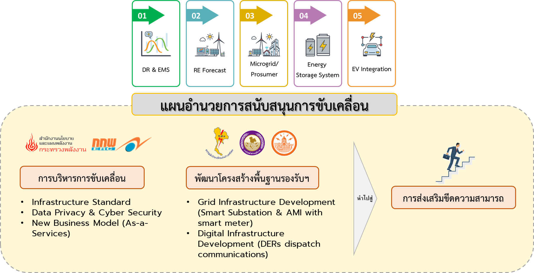 การดำเนินงานภายใต้แผนอำนวยการที่จะต้องมีการดำเนินภารกิจหรือกิจกรรมอื่น ๆ ที่มีความสำคัญและความจำเป็นคู่ขนานไปกับการดำเนินงานของทั้ง 5 เสาหลัก โดยวัตถุประสงค์หลัก คือ พัฒนาโครงสร้างพื้นฐานและเทคโนโลยีทั้งด้านระบบไฟฟ้าและด้านดิจิทัลเพื่อสนับสนุนการดำเนินงานด้านสมาร์ทกริด โดยด้านระบบไฟฟ้าจะมุ่งเน้นพัฒนาสถานีไฟฟ้าอัจฉริยะ (Smart Substation) และติดตั้ง AMI และสมาร์ทมิเตอร์ (Smart Meter) ให้ครอบคลุมการใช้งานทั่วประเทศ และในส่วนของด้านดิจิทัลที่จะต้องมีการดำเนินงานพัฒนาโครงข่ายการสื่อสาร 5G, ระบบบริหารจัดการพลังงาน (EMS), Cloud-Based Platform, Data Privacy, Cyber Security, Data Analytic, Block Chain, AI & Machine Learning และ 5G Network Slicing โดยเป้าหมายสำคัญของการพัฒนาและดำเนินการในส่วนของแผนอำนวยการ คือ “เพื่อช่วยสนับสนุนคู่ขนานไปกับ 5 เสาหลัก รวมถึงพัฒนาเทคโนโลยีสมัยใหม่เพื่อสนับสนุนงาน Smart Grid และพัฒนาให้เกิดรูปแบบธุรกิจใหม่ ๆ (New Business Model)” ซึ่งเป็นการเตรียมความพร้อมรองรับการเชื่อมต่อแหล่งพลังงานแบบกระจายศูนย์ (DERs) ที่สามารถสื่อสารและสั่งการเพื่อรองรับการดำเนินงานด้านสมาร์ทกริดเทคโนโลยีในอนาคต จากเป้าหมายฯ ข้างต้น สามารถนำมาเขียนเป็นแผนภาพความเชื่อมโยงดำเนินงานฯ ภายใต้แผนอำนวยการสนับสนุนการขับเคลื่อน ดังนี้