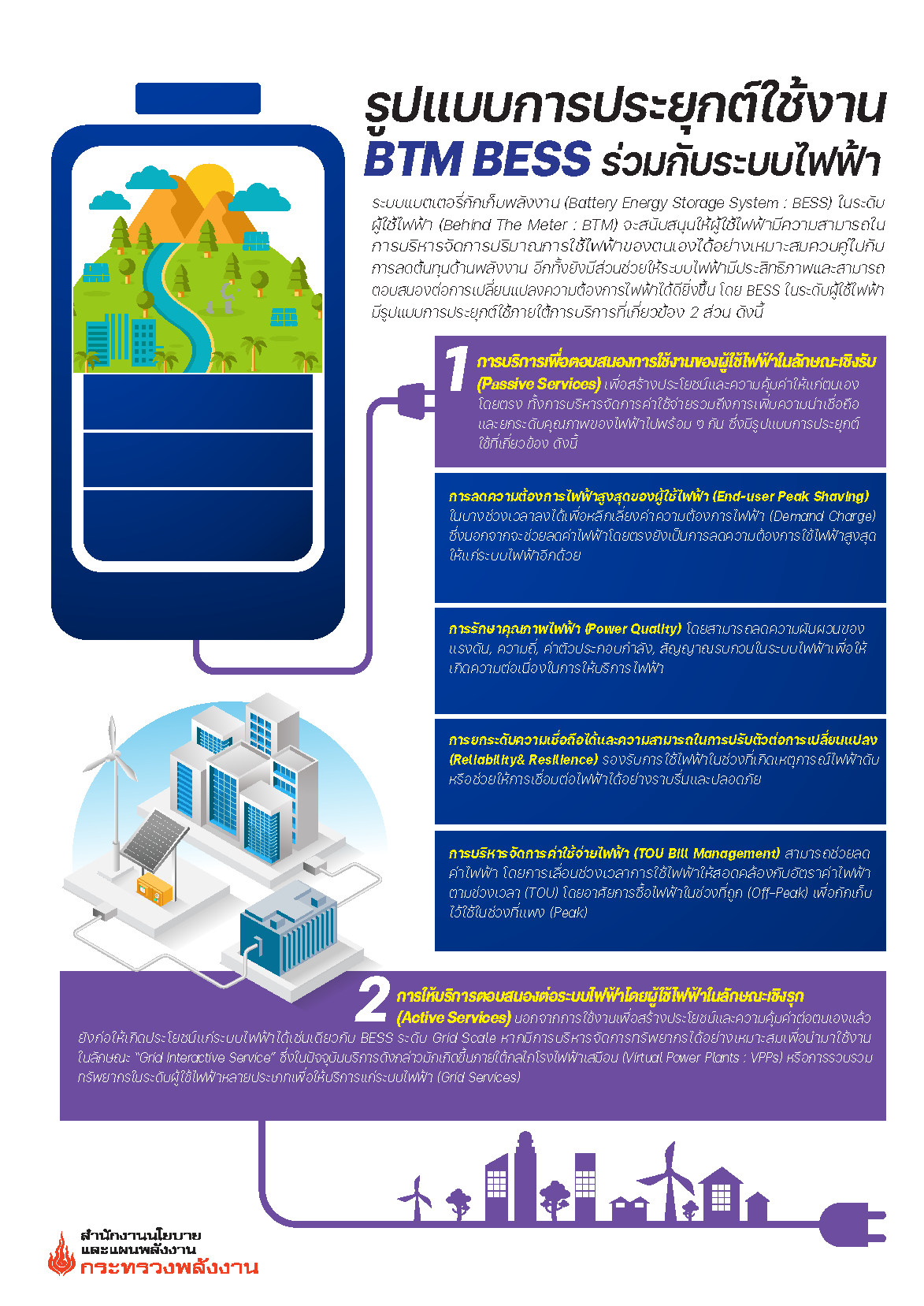 ระบบแบตเตอรี่กักเก็บพลังงาน (Battery Energy Storage System : BESS) ในระดับผู้ใช้ไฟฟ้า (Behind The Meter : BTM) จะสนับสนุนให้ผู้ใช้ไฟฟ้ามีความสามารถในการบริหารจัดการปริมาณการใช้ไฟฟ้าของตนเองได้อย่างเหมาะสมควบคู่ไปกับการลดต้นทุนด้านพลังงาน อีกทั้งยังมีส่วนช่วยให้ระบบไฟฟ้า มีประสิทธิภาพและสามารถตอบสนองต่อการเปลี่ยนแปลงได้ดียิ่งขึ้น โดย BESS ในระดับผู้ใช้ไฟฟ้ามีรูปแบบ การประยุกต์ใช้งานภายใต้การบริการที่เกี่ยวข้อง 2 ส่วน ดังนี้