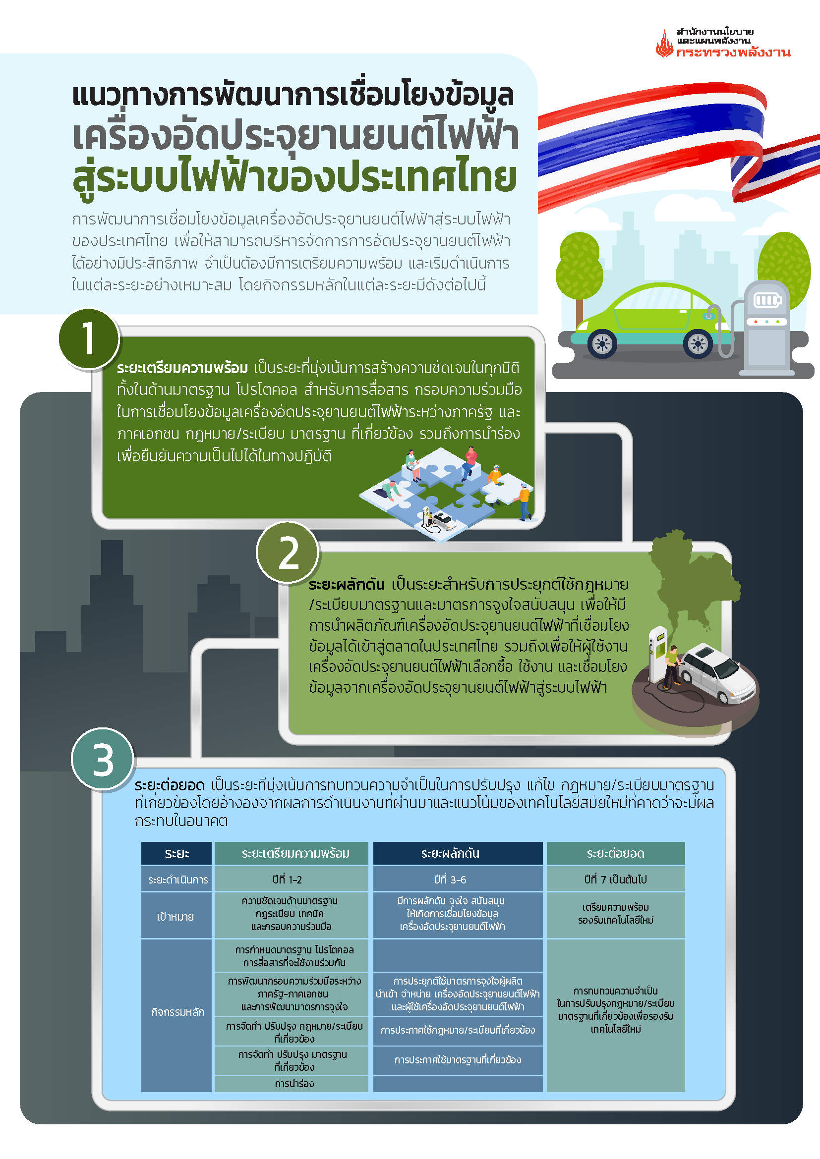 - ระยะเตรียมความพร้อม เป็นระยะที่มุ่งเน้นการสร้างความชัดเจนในทุกมิติ ทั้งในด้านมาตรฐาน โปรโตคอล สำหรับการสื่อสาร กรอบความร่วมมือในการเชื่อมโยงข้อมูลเครื่องอัดประจุยานยนต์ไฟฟ้าระหว่างภาครัฐและภาคเอกชน กฎหมาย/ระเบียบ มาตรฐาน ที่เกี่ยวข้อง รวมถึงการนำร่องเพื่อยืนยันความเป็นไปได้ในทางปฏิบัติ