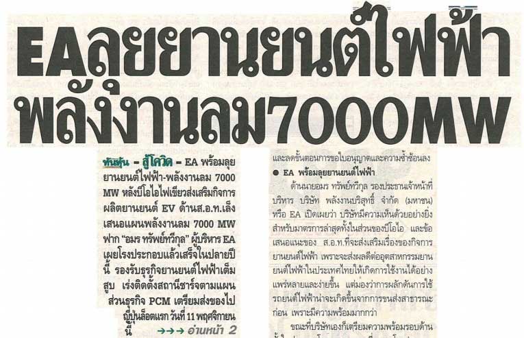 EA พร้อมลุยยานยนต์ไฟฟ้า-พลังงานลม 7000 MW หลังบีโอไอไฟเขียวส่งเสริมกิจการผลิตยานยนต์ EV ด้าน ส.อ.ท. เล็งเสนอแผนพลังงานลม 7000 MW ฟาก “อมร ทรัพย์ทวีกุล” ผู้บริหาร EA เผยโรงประกอบแล้วเสร็จในปลายปีนี้ รองรับธุรกิจยานยนต์ไฟฟ้าเต็มสูบ เร่งติดตั้งสถานัชาร์จตามแผน