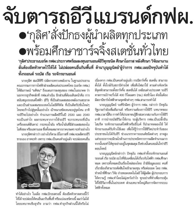 “กุลิศ” ประธานบอร์ด กฟผ. ประกาศพร้อมลงทุนยานยนต์อีวีทุกชนิด ศึกษาโอกาส หลังศึกษา วิจัยมานาน ลั่นต้องยึดหัวหาดไว้ให้ได้ ไม่ปล่อยคนอื่นกินพื้นที่ ด้าน “บุญญนิตย์” ผู้ว่าการ กฟผ. เผยปัจจุบันทำได้ทั้งรถยนต์ รถบัส เรือ รถจักรยายนต์