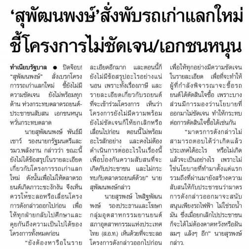 ปิดจ๊อบ! “สุพัฒนพงษ์” สั่งเบรกโครงการรถเก่าแลกใหม่ ชี้ยังไม่มีความชัดเจน ยังไม่พร้อมทุกด้าน ห่วงกระทบตลาดรถยนต์ประชาชนสับสน เอกชนหนุนหวั่นกระทบตลาด