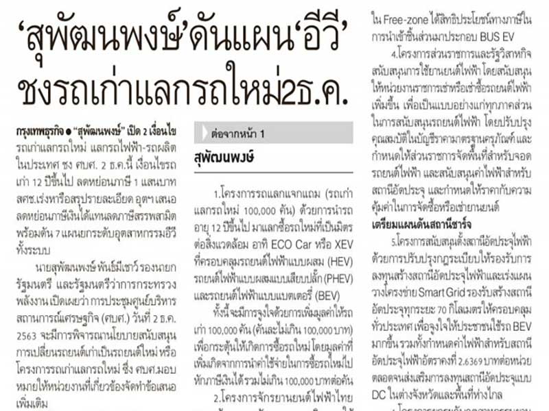 “สุพัฒนพงษ์” เปิด 2 เงื่อนไข รถเก่าแลกรถใหม่ แลกรถไฟฟ้า-รถผลิตในประเทศ ชง ศบศ. 2 ธ.ค. นี้ เงื่อนไขรถเก่า 12 ปีขึ้นไป ลดหย่อนภาษี 1 แสนบาท สคช.เร่งหารือสรุปรายละเอียด อุตฯ เสนอลดหย่อนภาษีเงินได้แทนลดภาษีสรรพสามิต พร้อมดัน 7 แผนยกระดับอุตสาหกรรมอีวีทั้งระบบ
