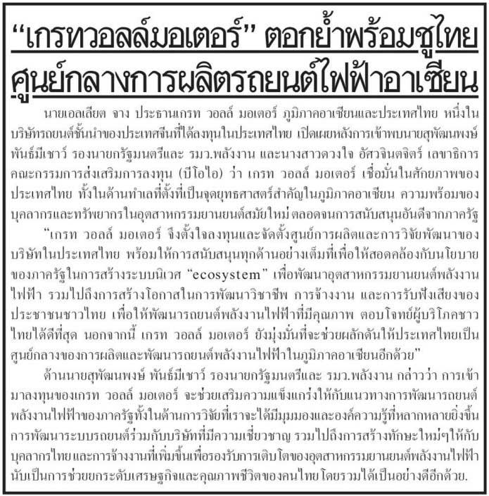 นายเอลเลียต จาง ประธานเกรท วอลล์ มอเตอร์ ภูมิภาคอาเซียนและประเทศไทย หนึ่งในบริษัทรถยนต์ชั้นนำของประเทศจีนที่ได้ลงทุนในประเทศไทย เปิดเผยหลังการเข้าพบนายสุพัฒนพงษ์ พันธ์มีเชาว์ รองนายกรัฐมนตรีและ รมว.พลังงาน และนางสาวดวงใจ อัศวจินตจิตร์ เลขาธิการ คณะกรรมการส่งเสริมการลงทุน (บีโอไอ)