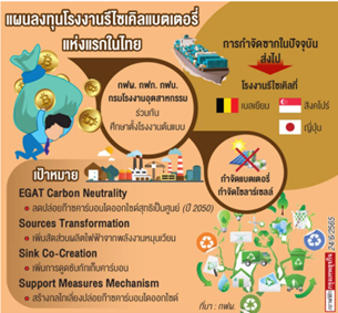 6 | กฟผ. เร่งแผน “ลดคาร์บอน” ลุยตั้งโรงงานรีไซเคิลแบตเตอรี่ | 6 | นายบุญญนิตย์ วงศ์รักมิตร ผู้ว่าการการไฟฟ้าฝ่ายผลิตแห่งประเทศไทย (กฟผ.) เปิดเผยว่า กฟผ.ได้ร่วมมือกับการไฟฟ้าส่วนภูมิภาค (กฟภ.) และการไฟฟ้านครหลวง (กฟน.) เพื่อศึกษาแนวทางการจัดตั้งโรงงานรีไซเคิลแบตเตอรี่ และแผงโซลาร์เซลล์ รวมทั้งได้ร่วมศึกษากับกรมโรงงานอุตสาหกรรมถึงความเป็นไปได้ในการลงทุนตั้งโรงงานรีไซเคิลแห่งแรกในประเทศไทย |