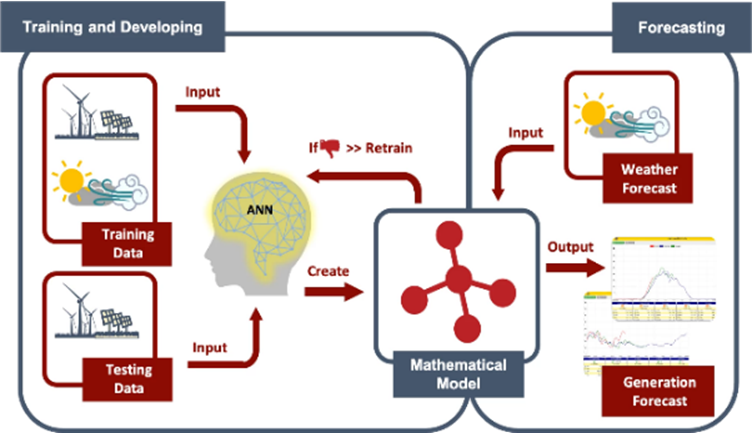8 | กฟผ. ใช้โครงข่ายประสาทเทียมพัฒนา “ระบบพยากรณ์ไฟฟ้าจากพลังงานหมุนเวียน” | 2 | กฟผ. ใช้เทคโนโลยีโครงข่ายประสาทเทียมพัฒนา “ระบบพยากรณ์การผลิตไฟฟ้าจากโรงไฟฟ้าพลังงานหมุนเวียน” ชี้เป็นเครื่องมือสำคัญที่ช่วยวางแผนการผลิตไฟฟ้าทั้งระบบให้มีประสิทธิภาพ โดยจะดำเนินการศึกษาแบบจำลองระบบพยากรณ์การผลิตไฟฟ้าจากพลังงานหมุนเวียน พ.ศ. 2562 – 2564 เพื่อเก็บรวบรวมข้อมูลที่จำเป็นสำหรับการคาดการณ์ปริมาณกำลังผลิตไฟฟ้า และนำมาจัดทำรูปแบบการพยากรณ์ที่มีความเหมาะสมกับการใช้งานในประเทศไทยมากที่สุด จากนั้นจะนำข้อมูลในอดีต ได้แก่ ข้อมูลสภาพอากาศ และข้อมูลการผลิตไฟฟ้าของโรงไฟฟ้า ระยะเวลาอย่างน้อย 1 ปี มาสร้างแบบจำลองโครงข่ายประสาทเทียม |