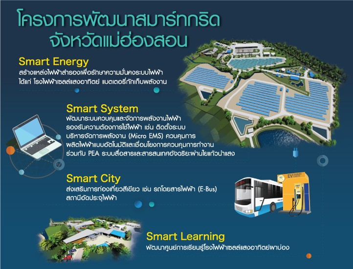 14 | หนุน “Smart Grid” ด้วย “Smart Energy” ชูโซลาร์และแบตเตอรี่ ช่วยระบบไฟฟ้าแม่ฮ่องสอนมั่นคง | 3,4 | แม่ฮ่องสอนเป็นจังหวัดที่มีความต้องการใช้ไฟฟ้าสูงขึ้นทุกปี และมีเหตุการณ์ไฟฟ้าตกไฟฟ้าดับอยู่บ่อยครั้ง และยาวนานที่สุด โครงการนำร่องการพัฒนาสมาร์ทกริดที่จังหวัดแม่ฮ่องสอนจึงเกิดขึ้นตามแผนพัฒนาระบบโครงข่ายไฟฟ้าอัจฉริยะของประเทศไทยในระยะสั้น พ.ศ. 2560 - 2564 ด้วยความร่วมมือของจังหวัดแม่ฮ่องสอน กระทรวงพลังงาน พพ. กฟผ. และ กฟภ. เพื่อเป็นต้นแบบในการนำเทคโนโลยีสมาร์ทกริดเข้ามาบริหารจัดการระบบไฟฟ้า ซึ่ง 1 ใน 4 ยุทธศาสตร์ Smart สำคัญที่จะสามารถช่วยขับเคลื่อนโครงการฯ นี้ได้ คือการเดินหน้า “Smart Energy” โดยเดินหน้าควบคู่ไปกับยุทธศาสตร์อีก 3 Smart จะช่วยเสริมศักยภาพของระบบไฟฟ้าในพื้นที่อำเภอเมืองแม่ฮ่องสอนให้มั่นคงได้ |