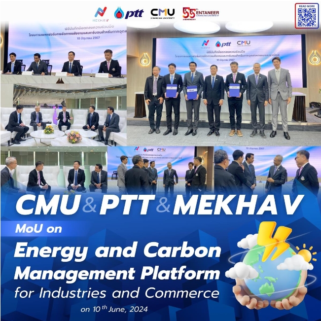 2 | CMU & PTT & MEKHA V MOU on Energy and Carbon Management Platform for Industries and Commerce | 3 | คณะวิศวกรรมศาสตร์ มหาวิทยาลัยเชียงใหม่ ร่วมกับ บริษัท ปตท. จำกัด (มหาชน) และ บริษัท เมฆา วี จำกัด ร่วมลงนามบันทึกข้อตกลงความร่วมมือทางวิชาการ โครงการแพลตฟอร์มการจัดการพลังงาน และคาร์บอนสำหรับภาคอุตสาหกรรมและพาณิชย์ (Energy and Carbon Management Platform for Industries and Commerce) เพื่อร่วมกันศึกษาการประยุกต์ใช้และต่อยอดพัฒนาแพลตฟอร์มการจัดการพลังงานและคาร์บอน เพื่อประเมินการปล่อยก๊าซเรือนกระจกฯ ประสิทธิภาพการใช้พลังงาน และโซลูชั่นการเพิ่มประสิทธิภาพการจัดการพลังงานและคาร์บอน ซึ่งจะเป็นประโยชน์ต่อคณะวิศวกรรมศาสตร์ที่จะได้มีความร่วมมือกับหน่วยงานภายนอกในการติดตั้งและทดสอบแพลตฟอร์มการจัดการคาร์บอน CarbonNote ในพื้นที่มหาวิทยาลัยเชียงใหม่ |